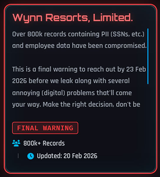 2024年2月,永利度假村(Wynn Resorts)发现系统被黑客入侵,员工个人身份信息(包括社会安全号码等)在ShinyHunters泄露平台上被曝光,涉及约80余万条记录,并勒索公司在2026年2月23日前付款,否则公开数据。永利随即启动事件响应,与外部安全专家合作展开调查,未影响赌客服务及酒店运营,且已为受影响员工提供免费信用监控与身份保护。该公司称被盗数据已被删除,但未披露具体受影响人数及是否付赎金。攻击归因于该组织使用社会工程学、OAuth令牌窃取等手段,突显了企业在身份验证与SaaS安全防护方面的薄弱。